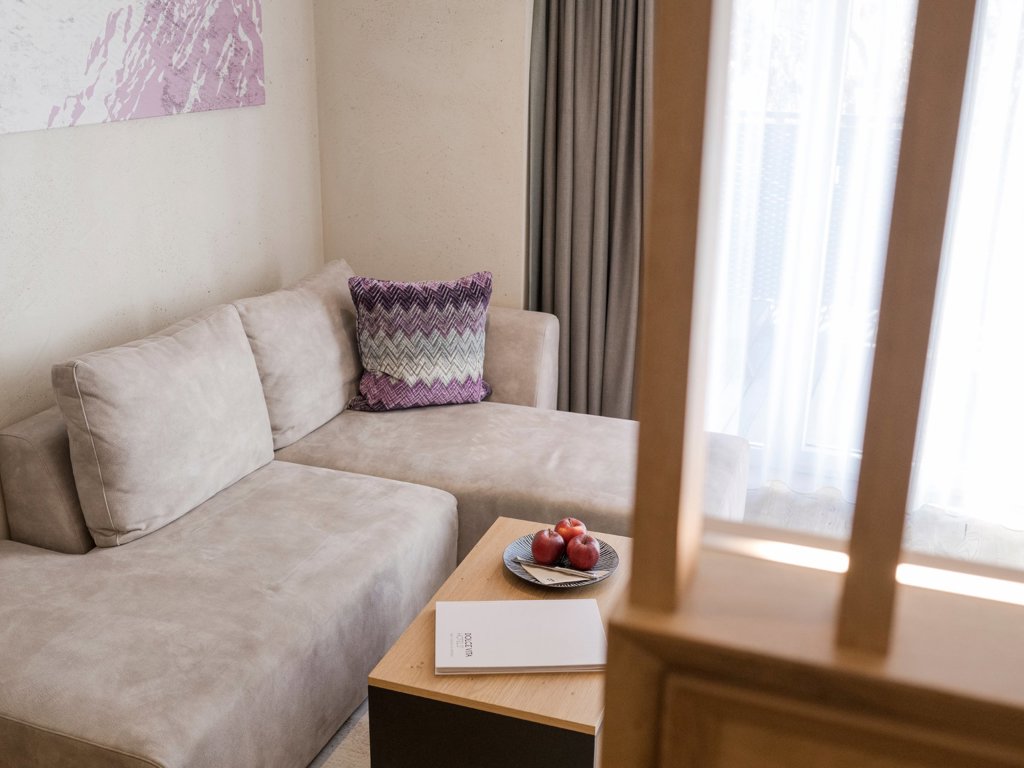 Wir haben Dolce Vita und das federleichte Lebensgefühl Südtirols eingefangen und in einer ganz besonderen Suite hochleben lassen. Unsere Dolce Vita Suite begeistert mit exklusiv ausgestattetem Wohnraum mit großer Kuschelecke, Holzboden, Naturholzmöbeln, großem, separatem Kinderzimmer mit einem Doppelbett und einem hochwertigem Couchbett für eine zusätzliche Person, modernem Badezimmer mit großer Walk-In-Dusche, Doppelwaschbecken, separatem WC, Minibar, Safe, 2 Flatscreen TV, Telefon, kostenlosem WLAN, großem Südbalkon mit Daybed, Garagenplatz und Klimaanlage.
