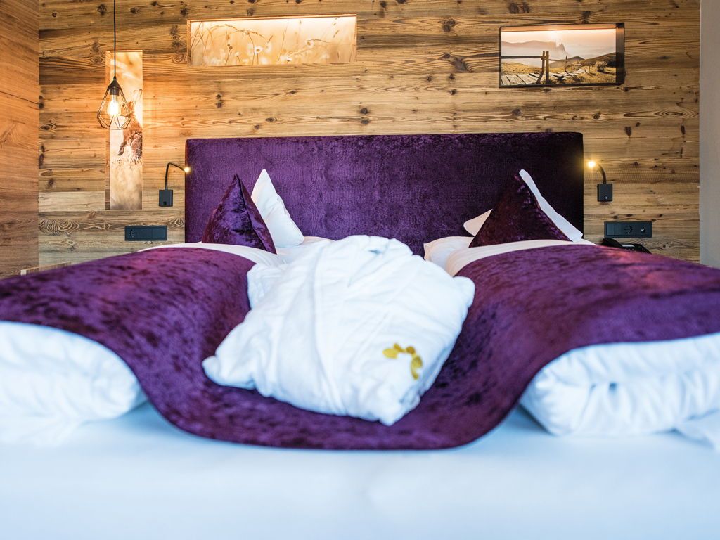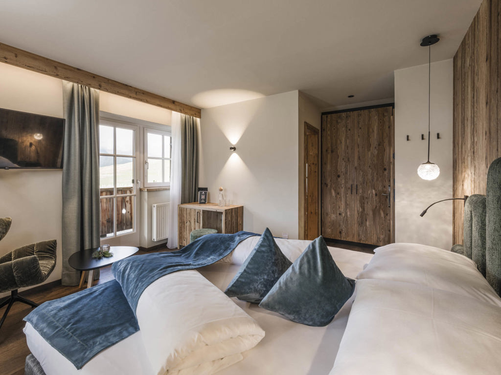 Doppelzimmer 30 m² aus edler Eiche mit paradiesischem Nordblick auf die Seiser Alm und die umliegende Bergwelt.