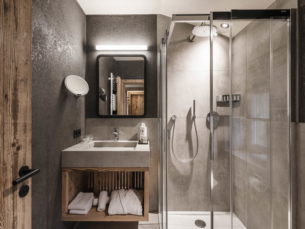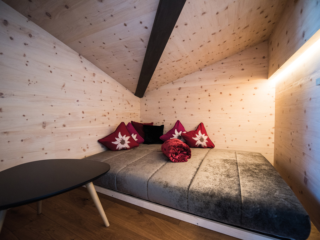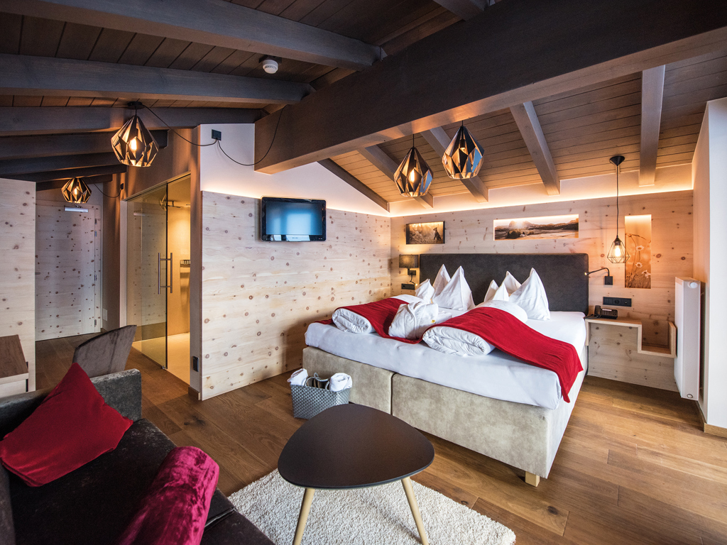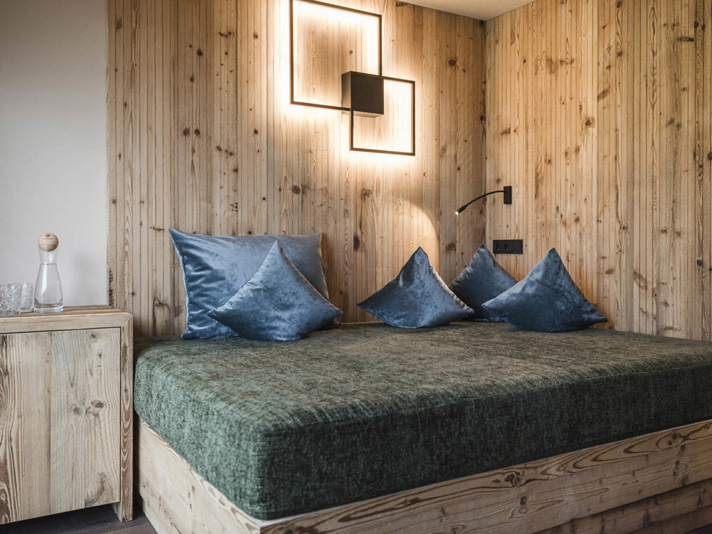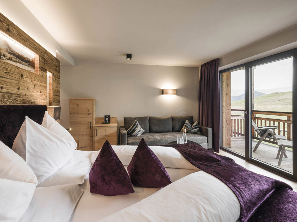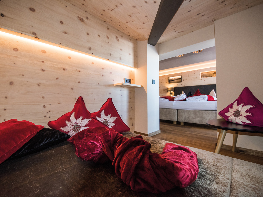 Die Junior Suiten im 3. Stock bieten Dachterrasse zur Nordseite mit Blick über die Seiser Alm oder Balkon zur Südseite mit Blick auf die Roßzähne, Marmolata, Lang- und Plattkofel sowie den Naturbadeteich. Der Wohnbereich kann durch eine Schiebetür vom Schlafbereich abgetrennt werden.