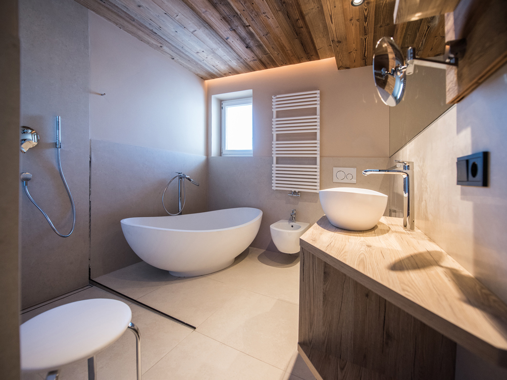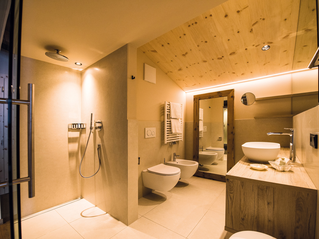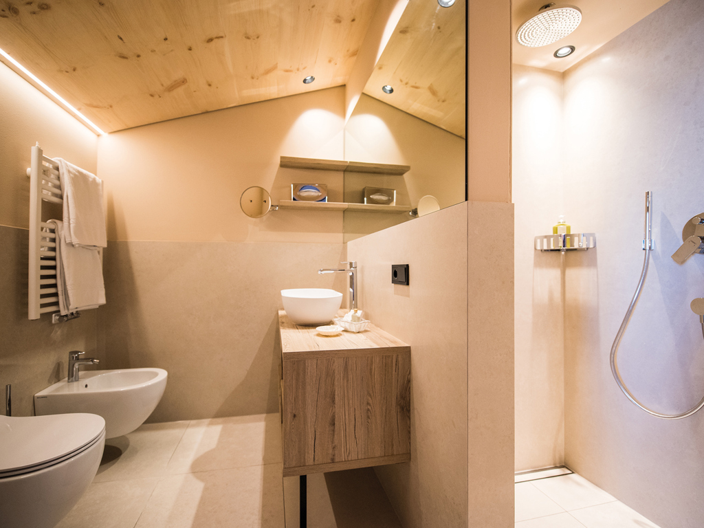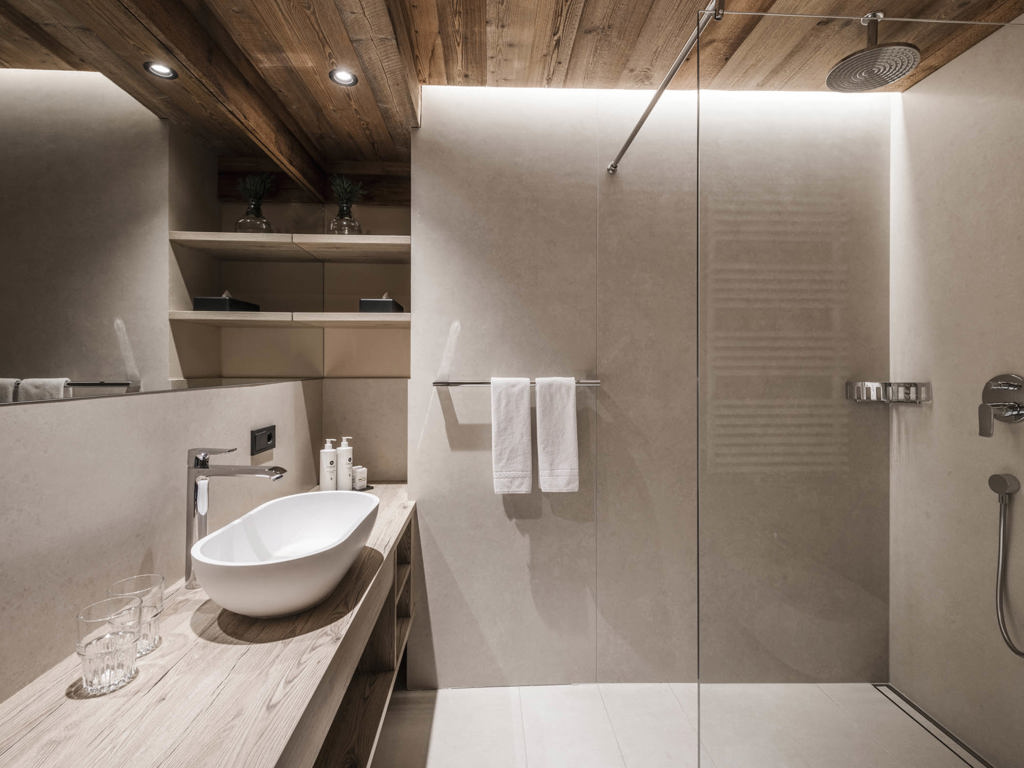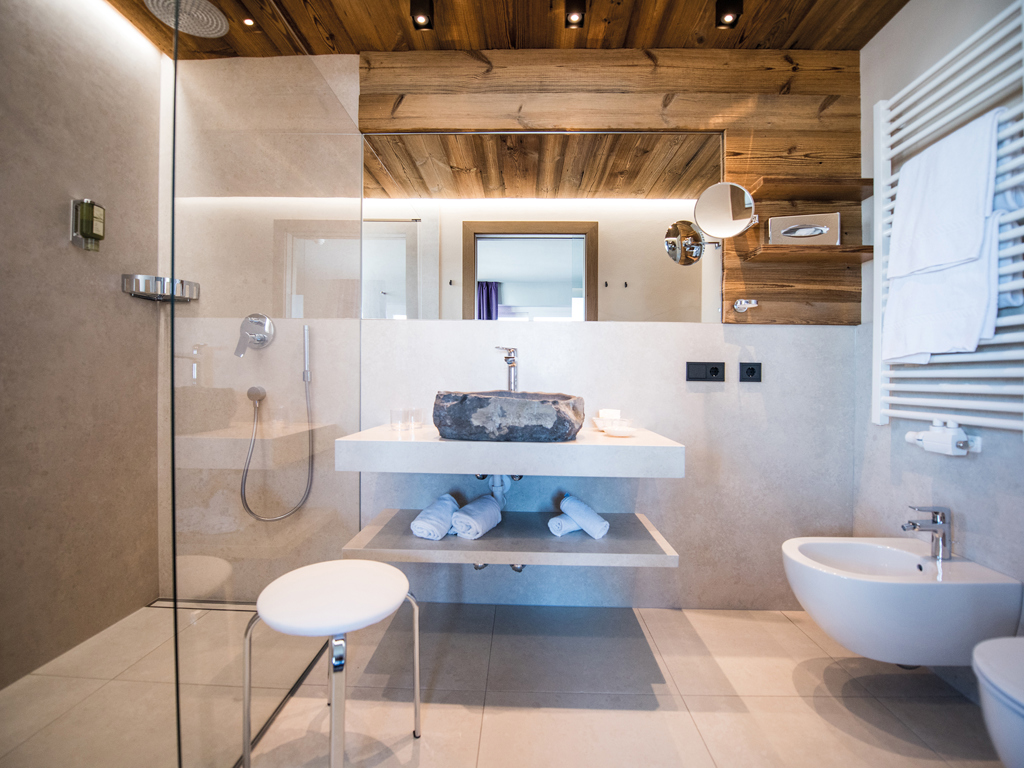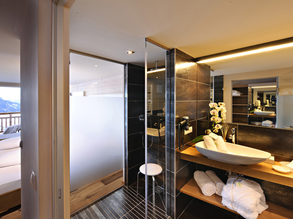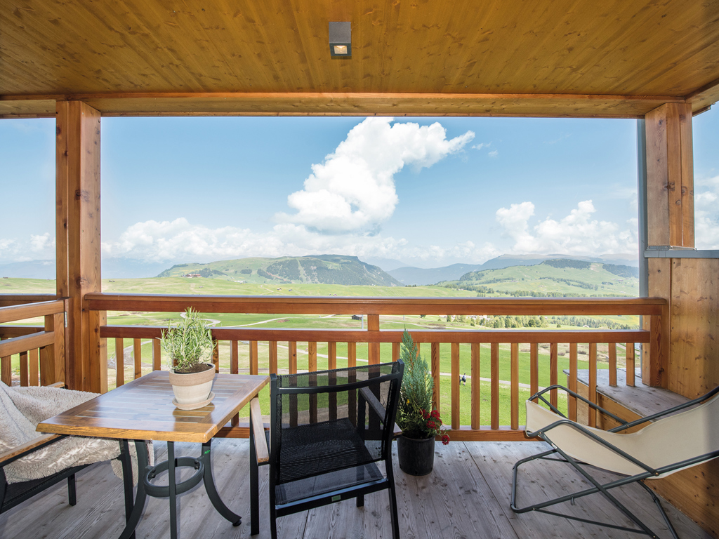 Die Junior Suiten im 3. Stock bieten Dachterrasse zur Nordseite mit Blick über die Seiser Alm oder Balkon zur Südseite mit Blick auf die Roßzähne, Marmolata, Lang- und Plattkofel sowie den Naturbadeteich. Der Wohnbereich kann durch eine Schiebetür vom Schlafbereich abgetrennt werden.