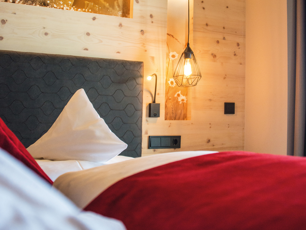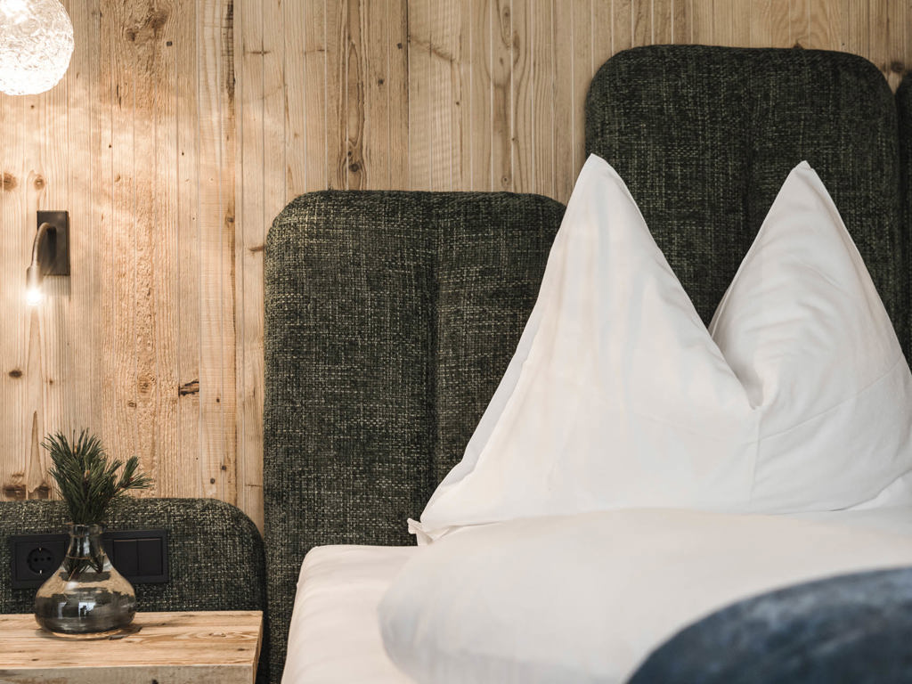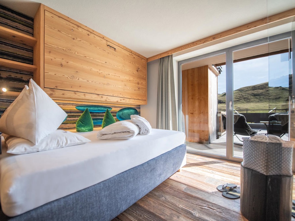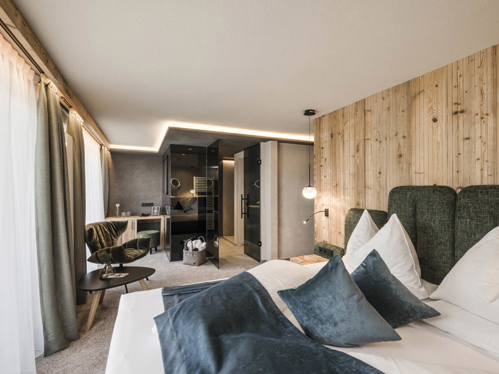 Doppelzimmer 30 m² in alpinem Zirbenholz-Design mit privatem Südbalkon inklusive traumhafter Aussicht auf die Dolomiten.