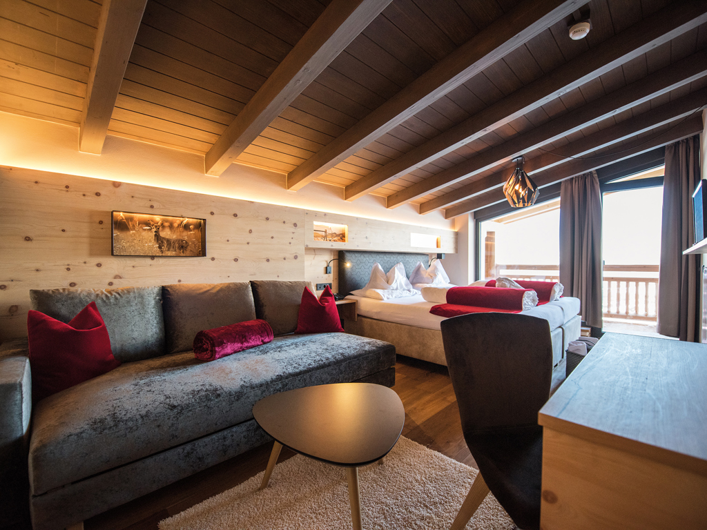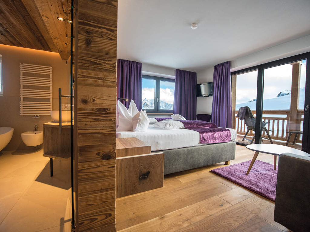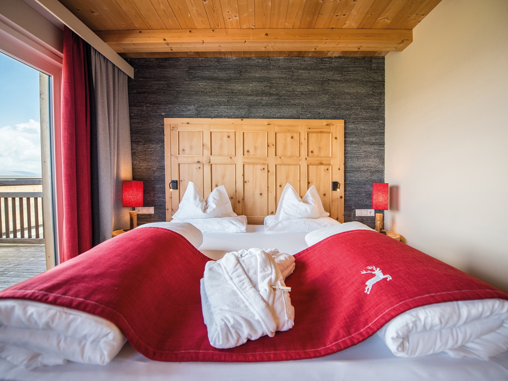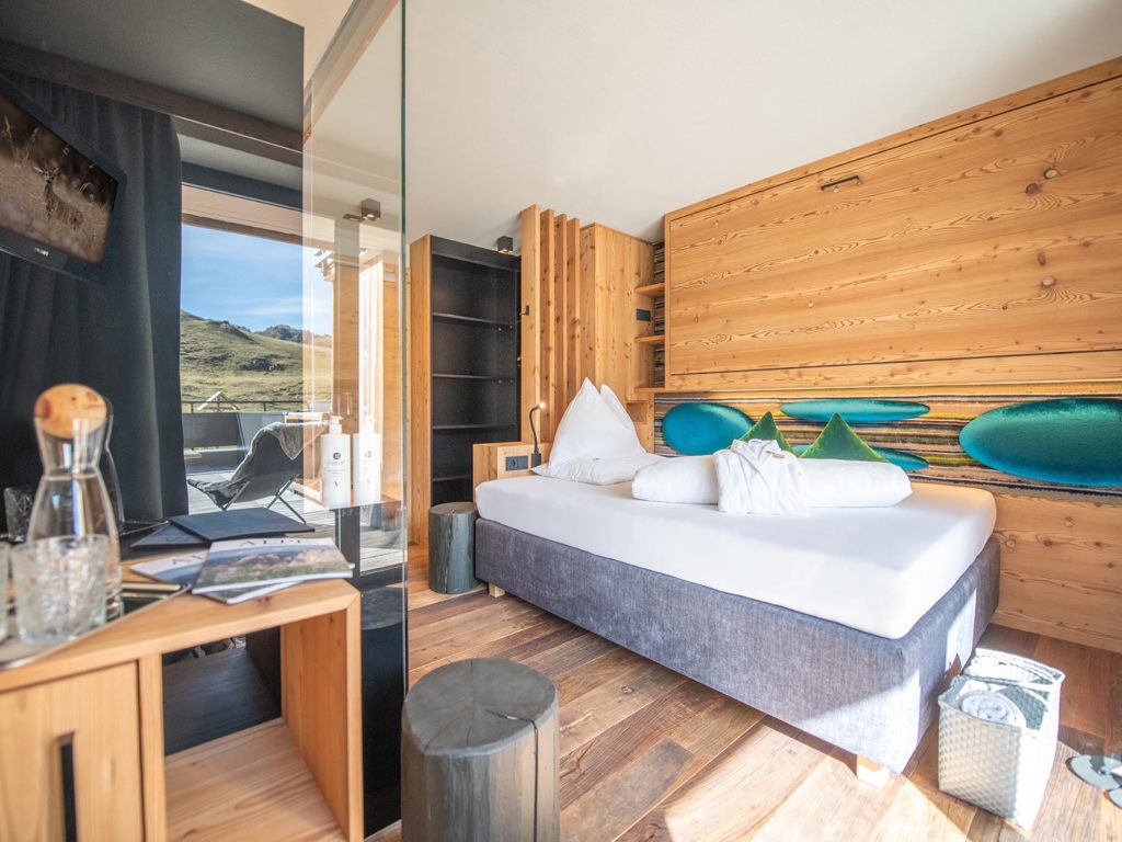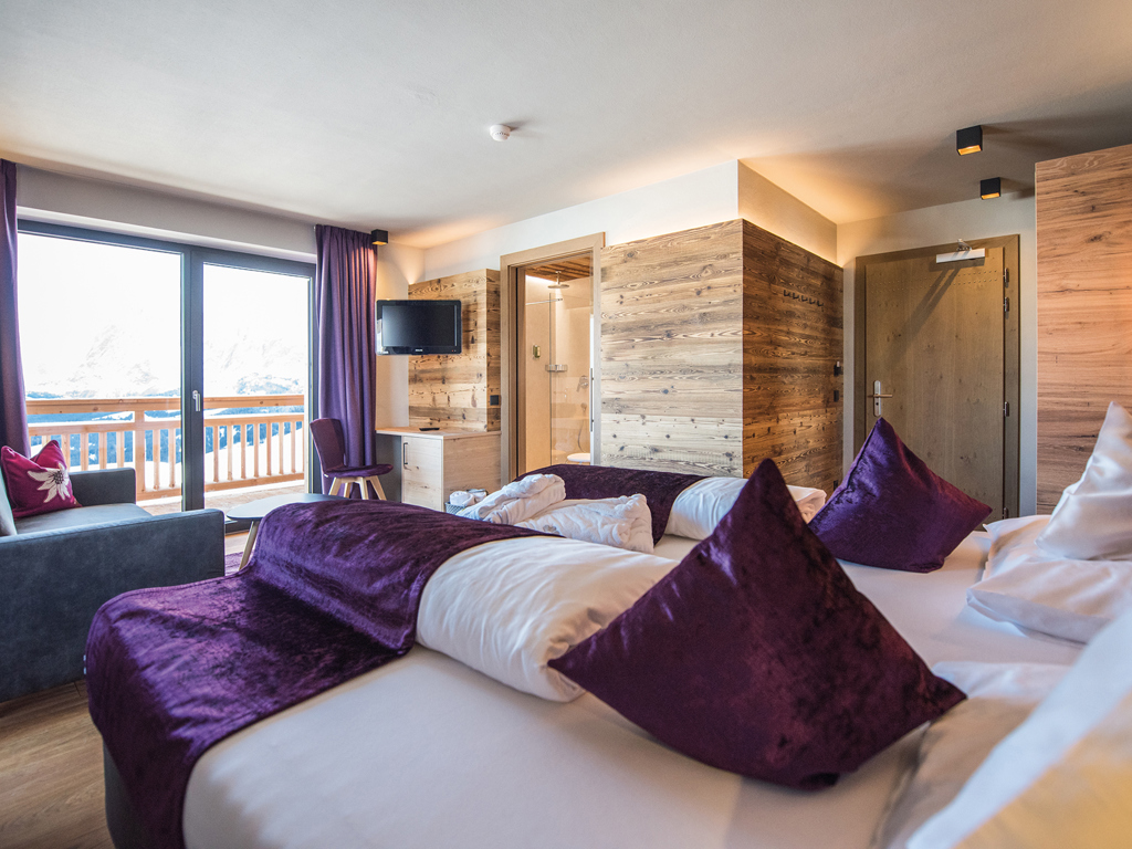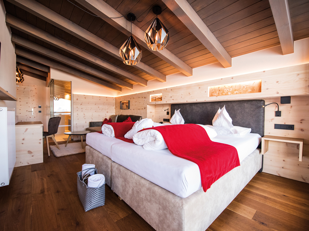 Alpines Wohnen im 27 m² Design-Doppelzimmer aus Altholz. Zwei getrennte Panoramabalkone zur Ost- und Nordseite laden zum Draußen sein ein.