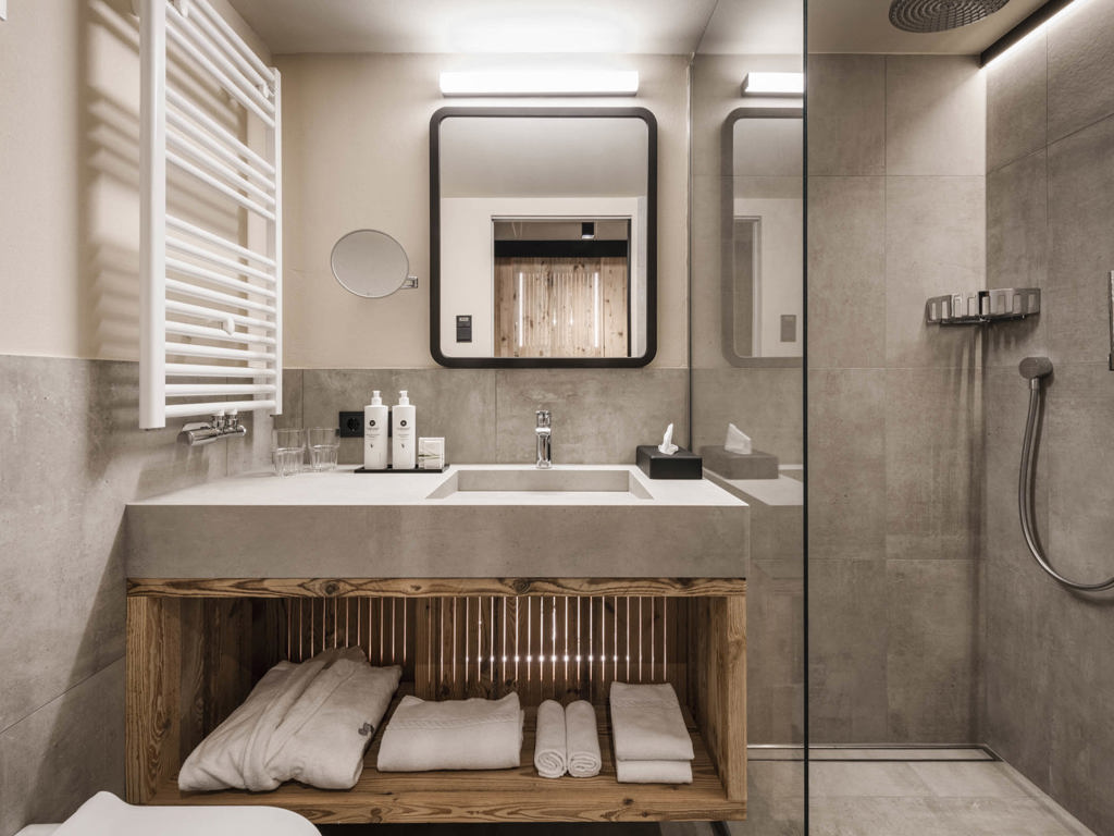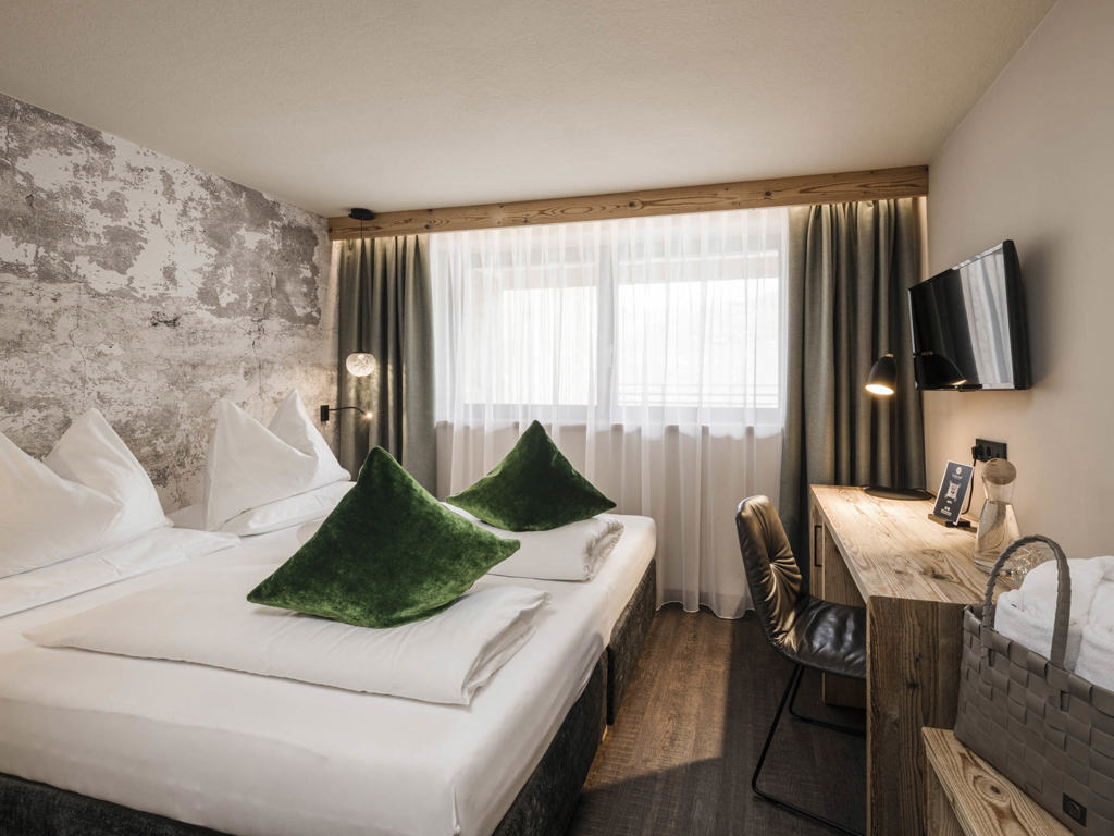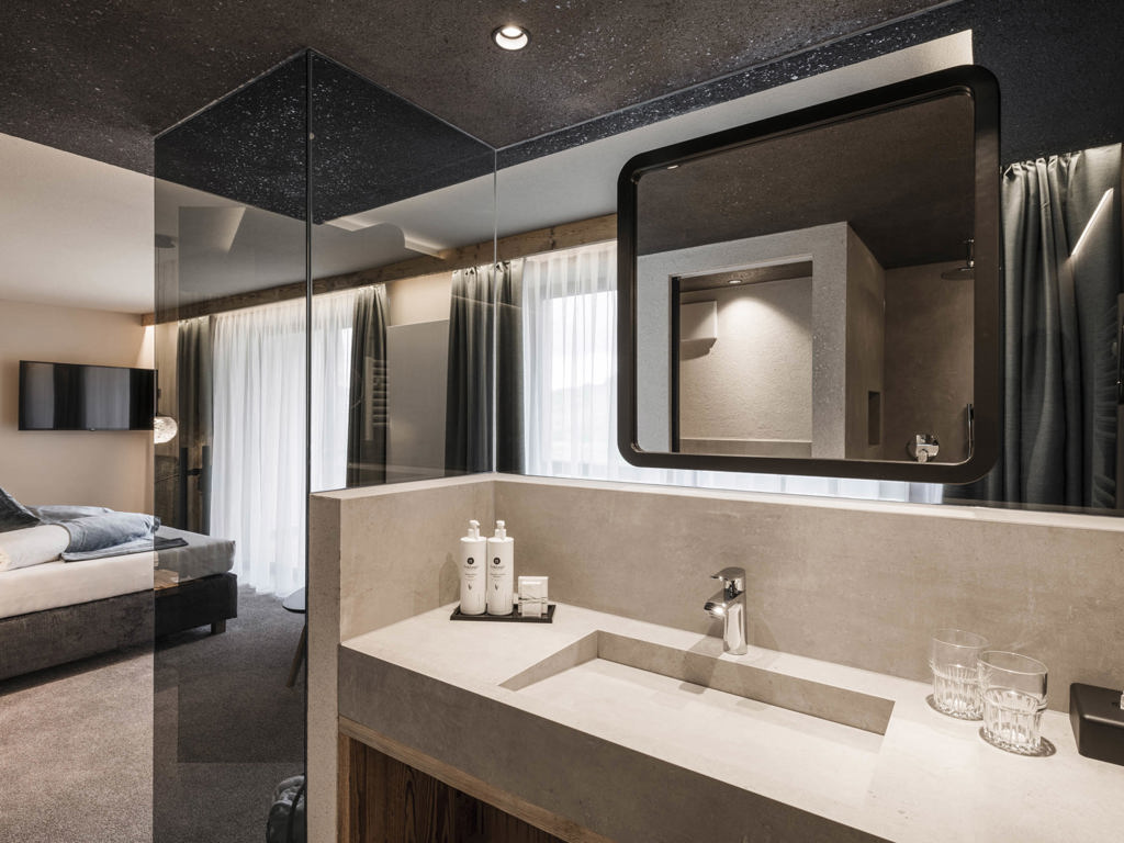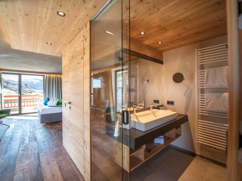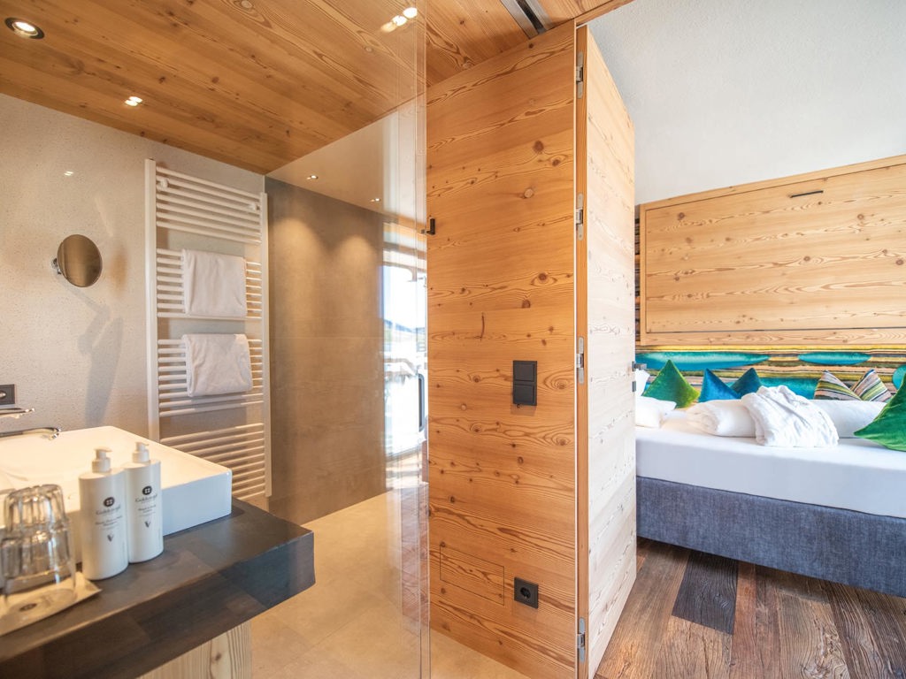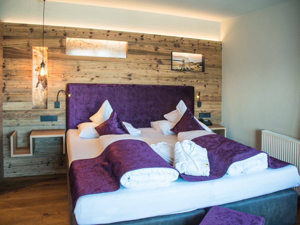 Alpines Wohnen im 27 m² Design-Doppelzimmer aus Altholz. Zwei getrennte Panoramabalkone zur Ost- und Nordseite laden zum Draußen sein ein.