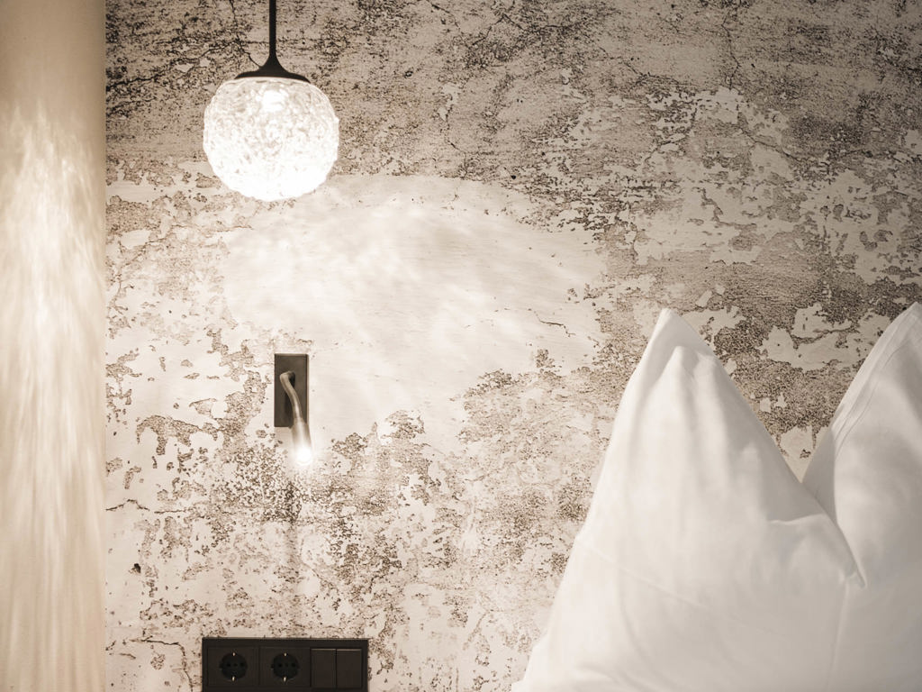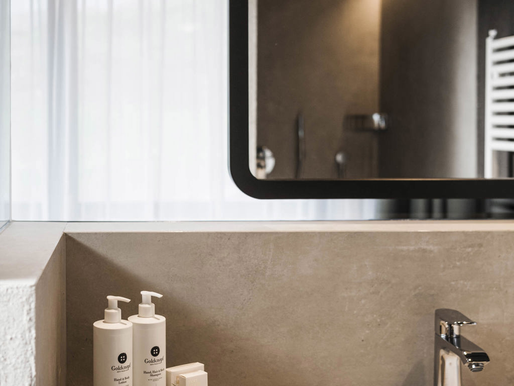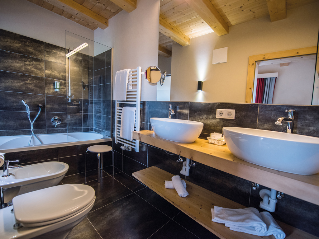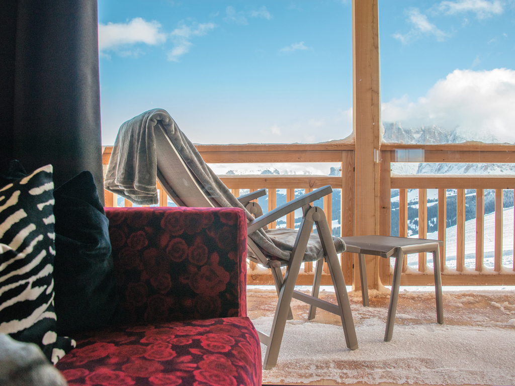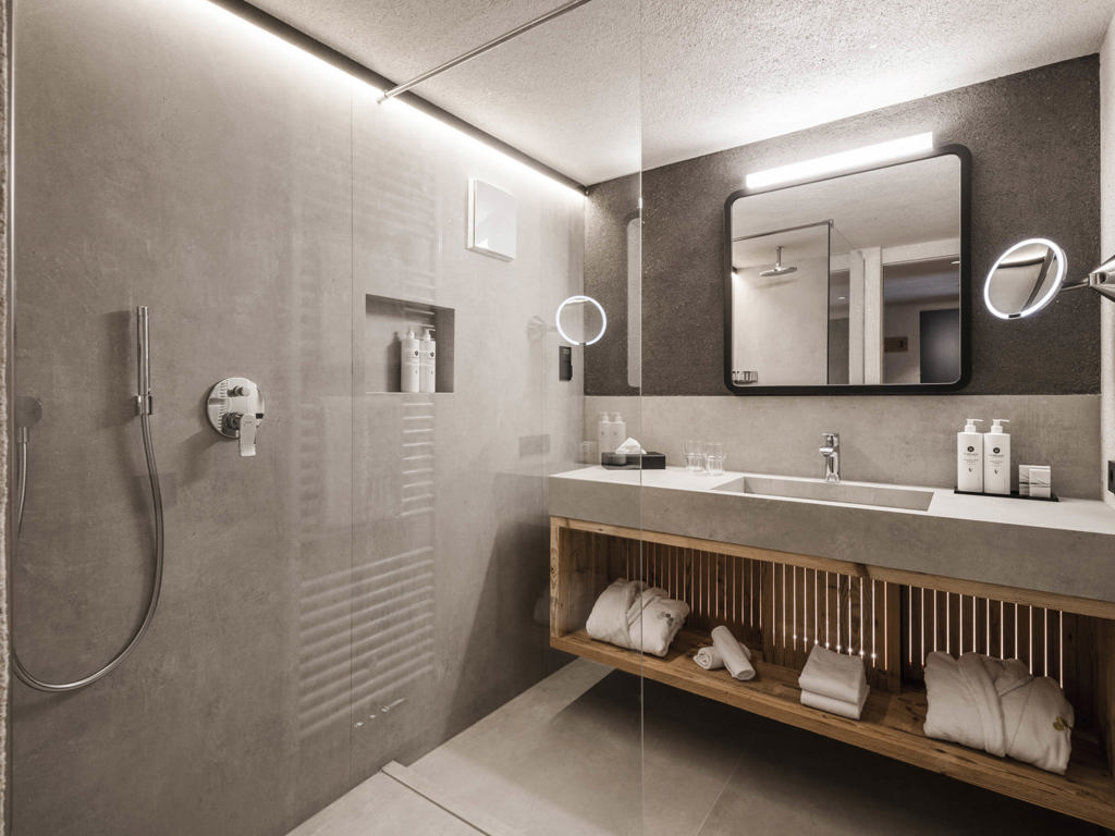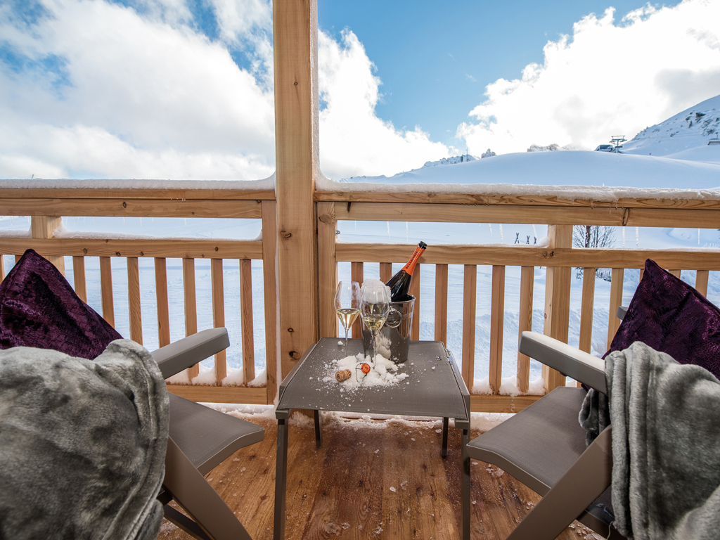 Alpines Wohnen im 27 m² Design-Doppelzimmer aus Altholz. Zwei getrennte Panoramabalkone zur Ost- und Nordseite laden zum Draußen sein ein.