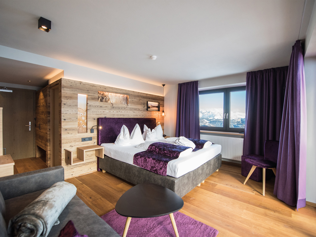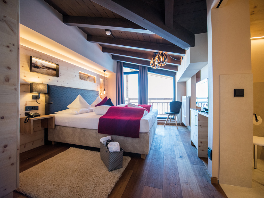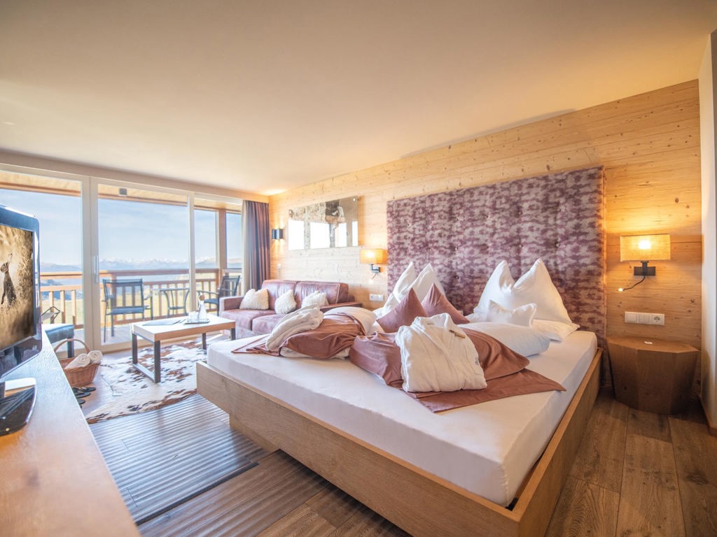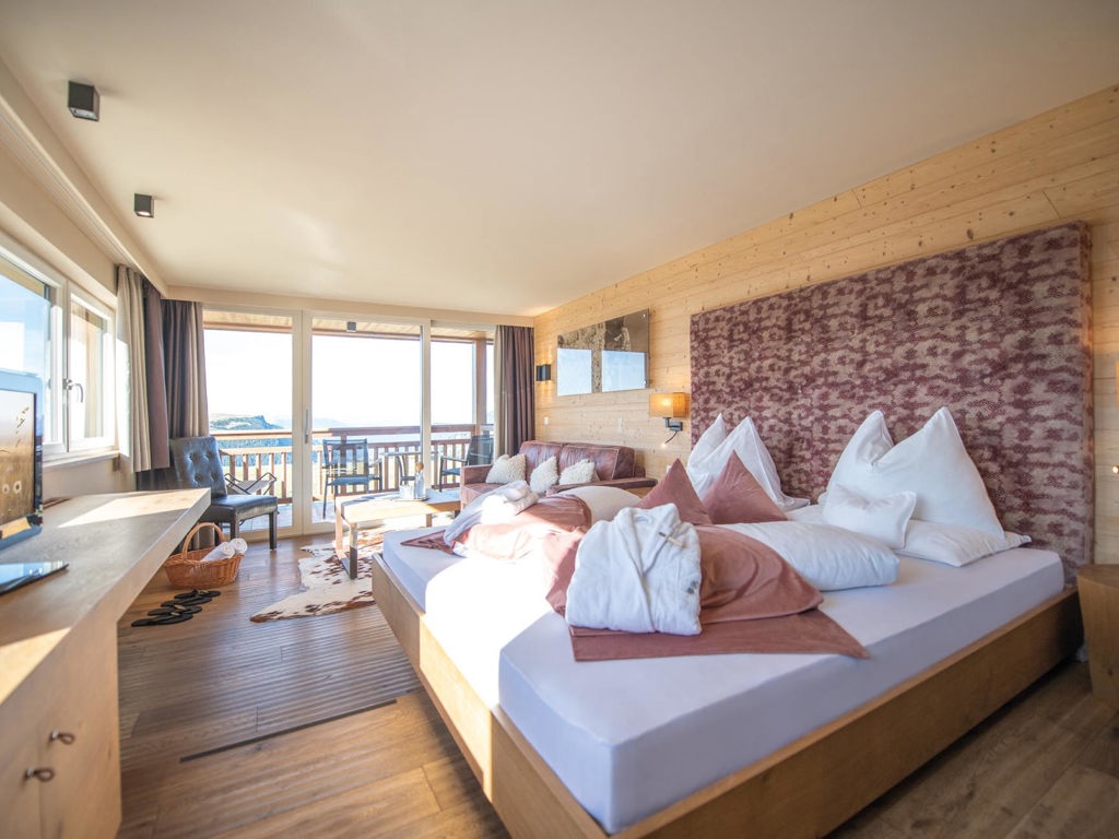 Doppelzimmer 27 m² mit alpinem Altholz-Design und 180° Ausblick zur sonnigen Süd- und Ostseite.