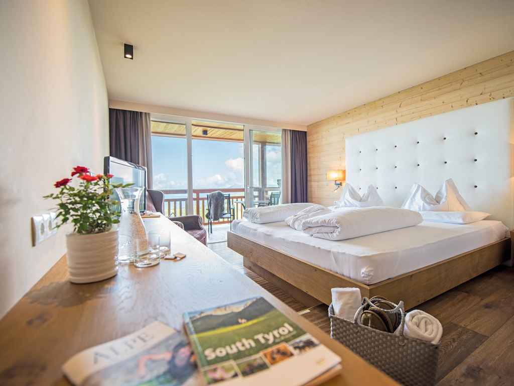 Doppelzimmer 27 m² aus edler Eiche mit Balkon zur Nordseite und Ausblick über die Seiser Alm und zu den Dolomitengipfeln.