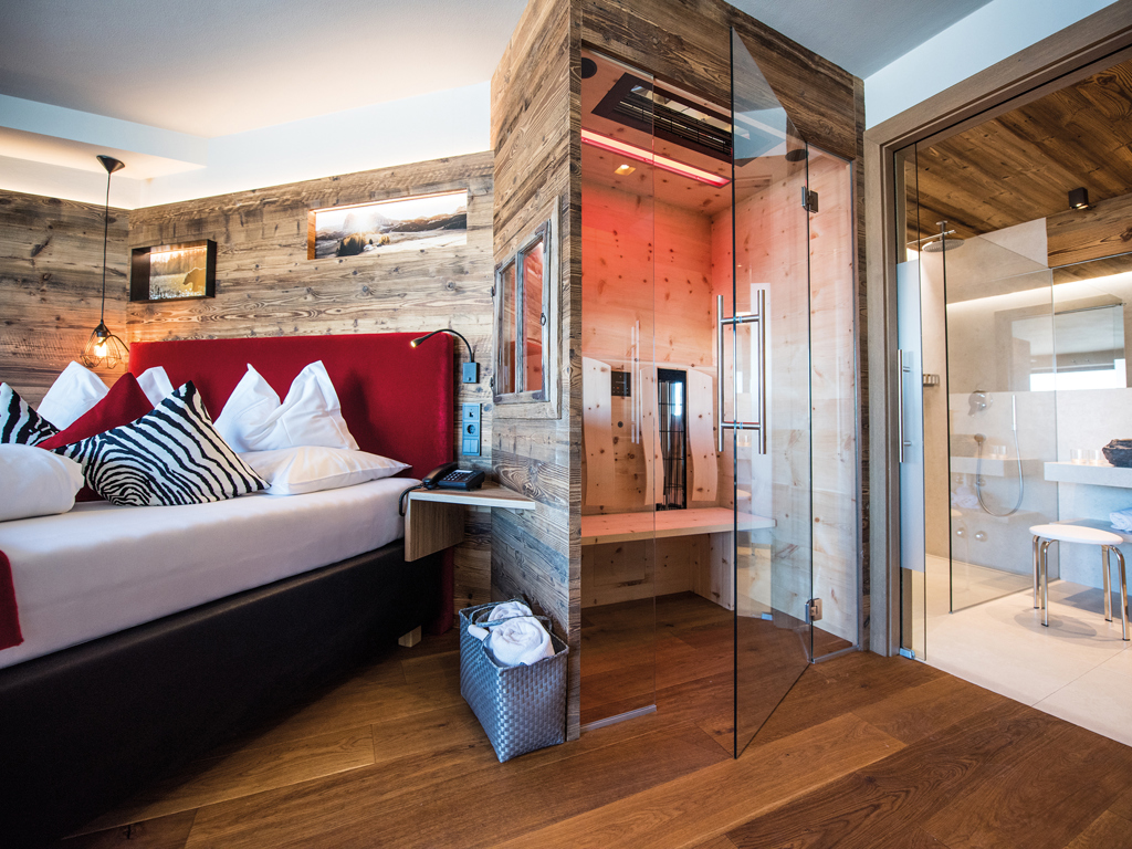 Alpines Wohnen im Design-Doppelzimmer aus Altholz mit Terrasse zur Nordseite.