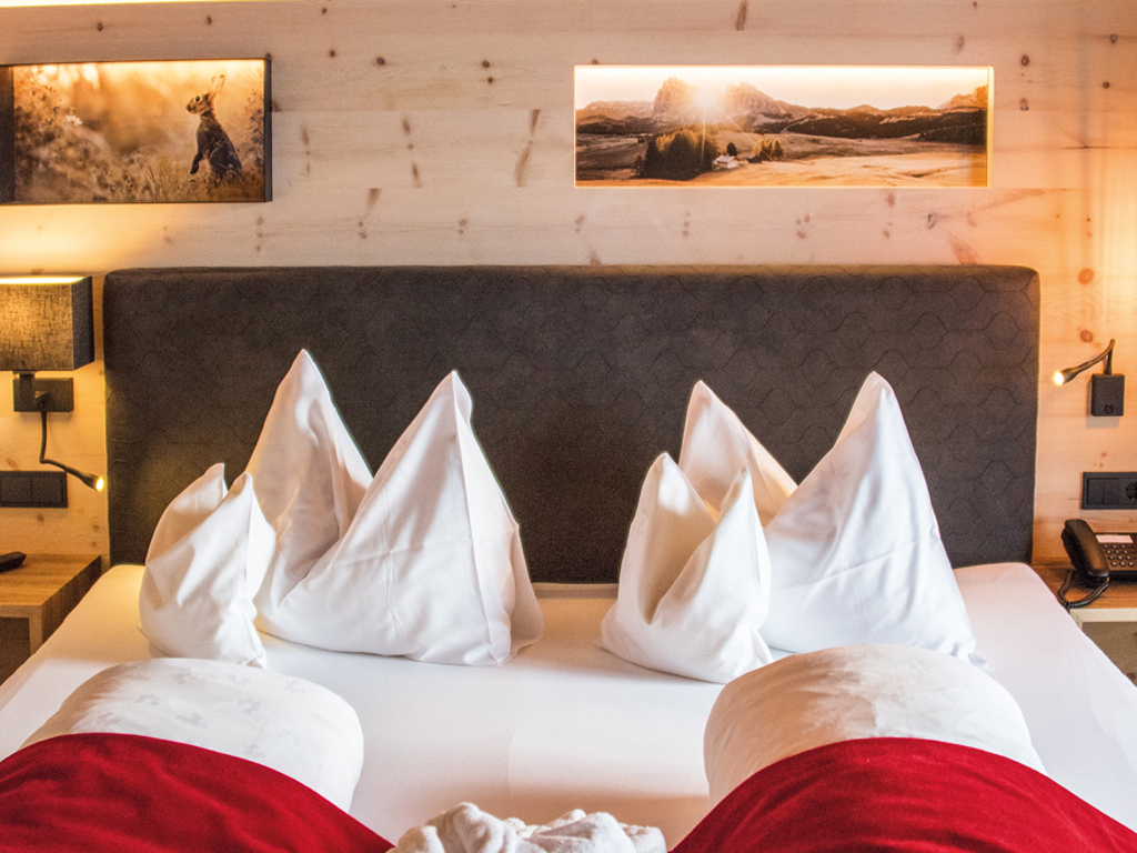 Doppelzimmer mit alpinem Zirbenholz-Design und Balkon mit traumhaftem Ostblick zu Lang- und Plattkofel sowie den einzigartigen Dolomitengipfeln.