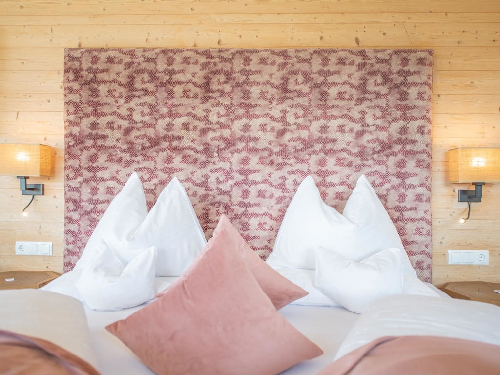 Doppelzimmer 28 m² aus alpinem Altholz Design mit einzigartigem Südblick auf die umliegende Bergwelt und den Naturbadeteich.
